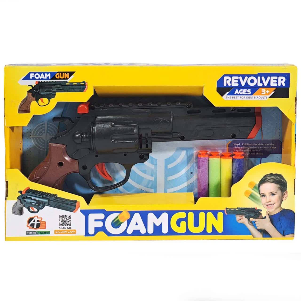 تفنگ اسباب بازی هفت تیر فوم پران جعبه ای مناسب برای کودکان 3 سال به بالا می باشد. این تفنگ پلاستیکی کیفیت خوبی داشته و با تیر های فومی بی خطر سرگرمی مناسبی برای پسر بچه ها است.